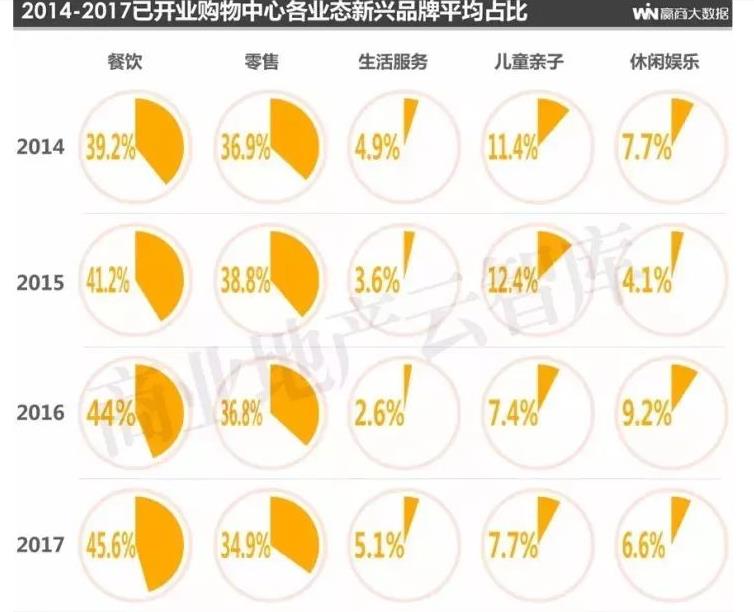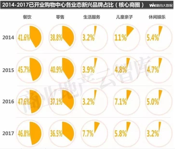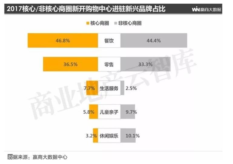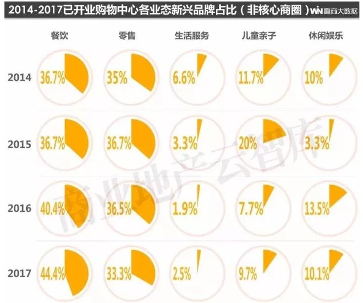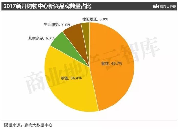 2017ÄêпªÒµ¹ºÎïÖÐÐÄÖУ¬ÖÖÖÖҵ̬½ø×¤µÄÐÂÐËÆ·ÅÆÕ¼±ÈΪ£º²ÍÒû46.7%¡¢ÁãÊÛ36.4%¡¢¶ùͯÇ××Ó6.7%¡¢ÉúÑÄ·þÎñ7.3%¡¢ÐÝÏÐÓéÀÖ3%£¨Õ¼±ÈÊý¾Ý=¸÷ϸ·Öҵ̬ÐÂÐËÆ·ÅÆÊý/¹ºÎïÖÐÐÄÐÂÐËÆ·ÅÆ×ÜÊý£¬ÏÂͬ£©£¬½ø×¤¹ºÎïÖÐÐĵÄÐÂÐËÆ·ÅÆÖ÷Òª¼¯ÖÐÔÚÁãÊۺͲÍÒûҵ̬¡£