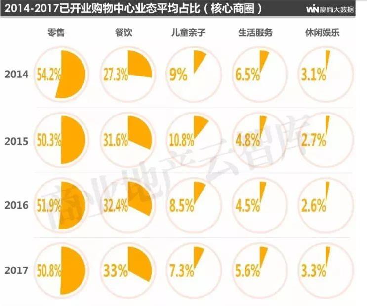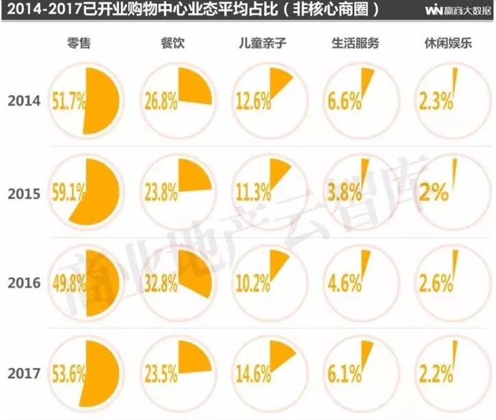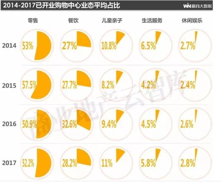 ÕûÌåÀ´¿´£¬2017Ä꿪ҵµÄ¹ºÎïÖÐÐÄ£¬ÖÖÖÖҵ̬ռ±ÈΪ£ºÁãÊÛ52.2%¡¢²ÍÒû28.2%¡¢¶ùͯÇ××Ó11%¡¢ÉúÑÄ·þÎñ5.8%¡¢ÐÝÏÐÓéÀÖ2.8%¡£