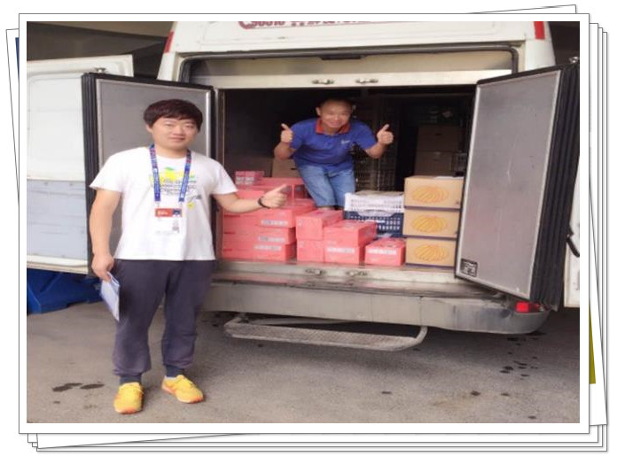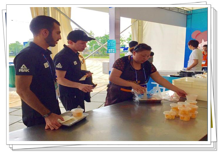 赛事时代,为确保服务事情的有序举行,公司组织专人专车全程服务,从破晓四点最先忙碌到晚上十点才竣事,天天准时准点的将3000余份全心制作的营养康健餐食送到赛事后勤事情职员手中,快要百种日用品、水果、休闲食物、西式面点等送抵达服务所在。
